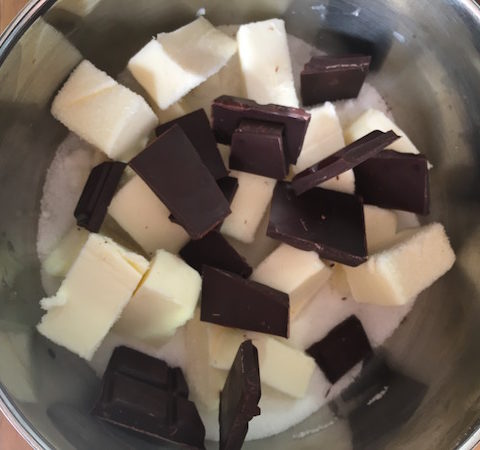 - Sciogliete a bagnomaria metà dello zucchero col burro e il cioccolato fondente fatto a pezzi fino ad ottenere una crema omogenea.