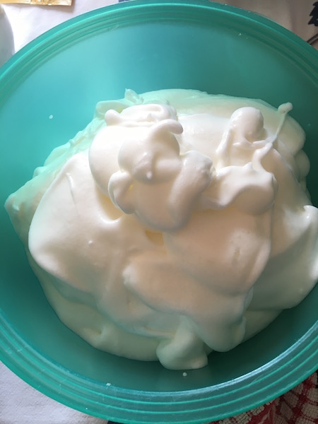 - Prendete gli albumi montati a neve e uniteli al composto. Amalgamate lentamente e bene, mescolando dal basso verso l’alto.