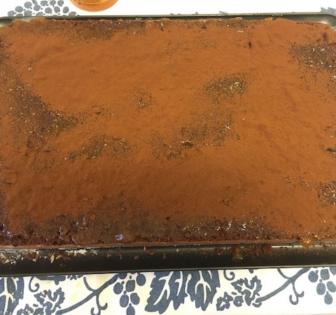 - Una volta ricomposta la torta, spalmate anche tutta la superficie e i lati con la marmellata di albicocche, ultimando, come in precedenza, con una spolverata di cacao amaro.
