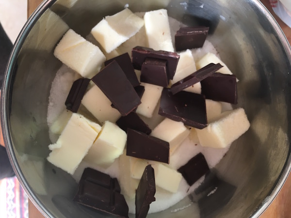 - Sciogliete a bagnomaria metà dello zucchero col burro e il cioccolato fondente fatto a pezzi fino ad ottenere una crema omogenea.