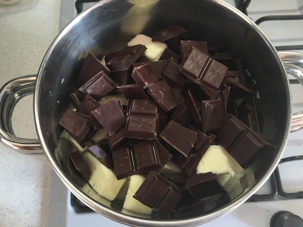 - Preparate la glassa, sciogliendo il cioccolato a bagnomaria, aiutandovi in questo processo unendo un pò di latte e dell’acqua.