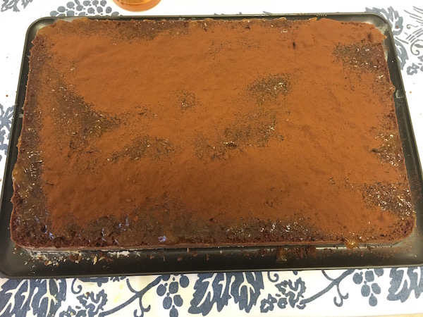 - Una volta ricomposta la torta, spalmate anche tutta la superficie e i lati con la marmellata di albicocche, ultimando, come in precedenza, con una spolverata di cacao amaro.