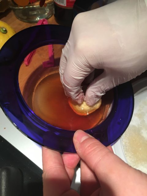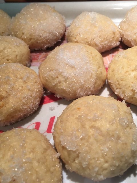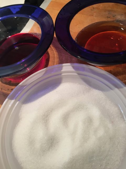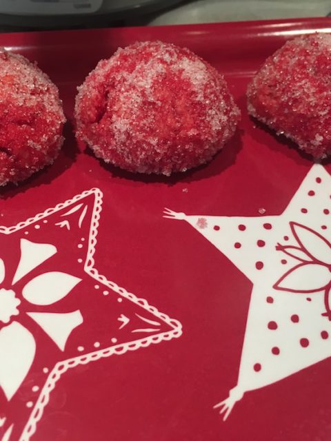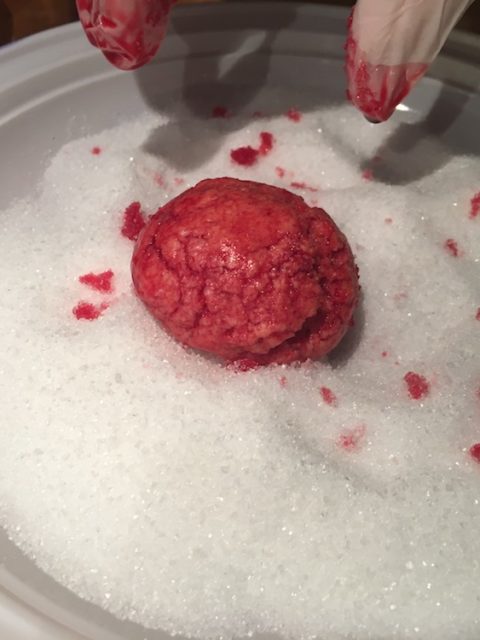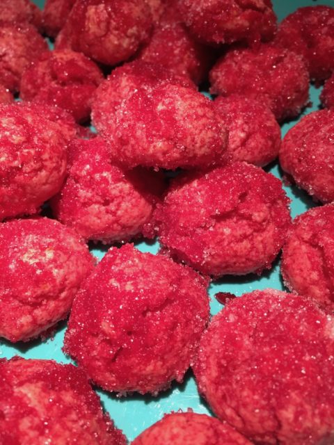 - Dopo aver terminato la cottura, ancora calde, passatele velocemente in una ciotola in cui avrete posto l’alchermes e subito dopo passatele nello zucchero semolato.