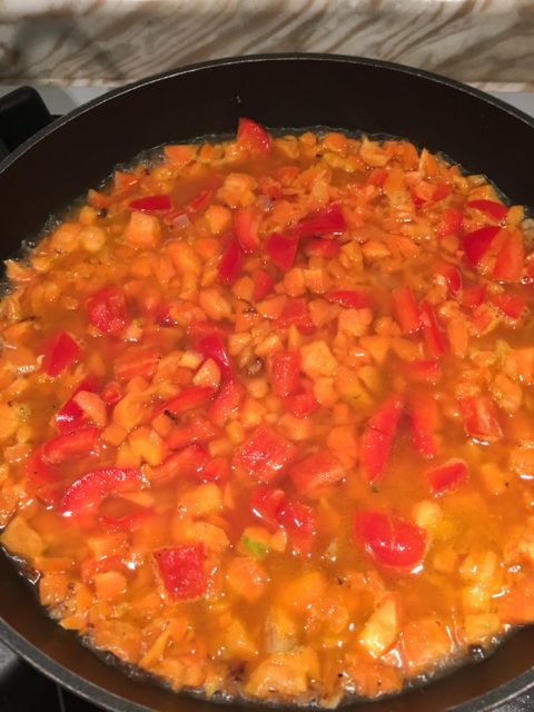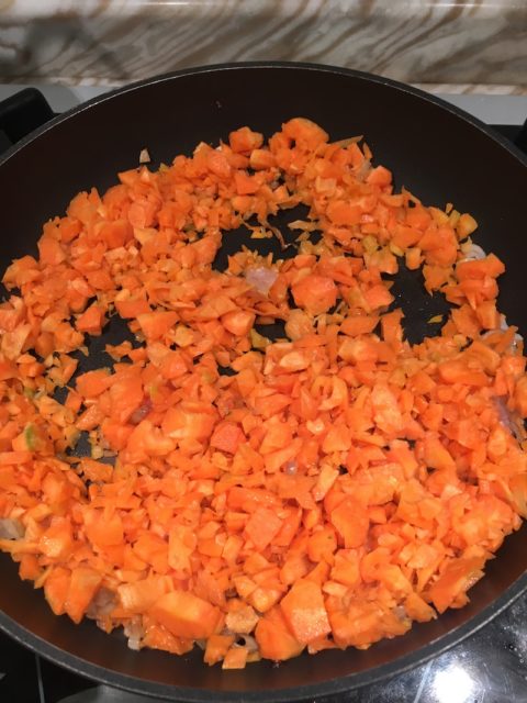 - Dopo poco tempo aggiungete i peperoni e le carote e coprite il tutto con un bicchiere d’acqua.