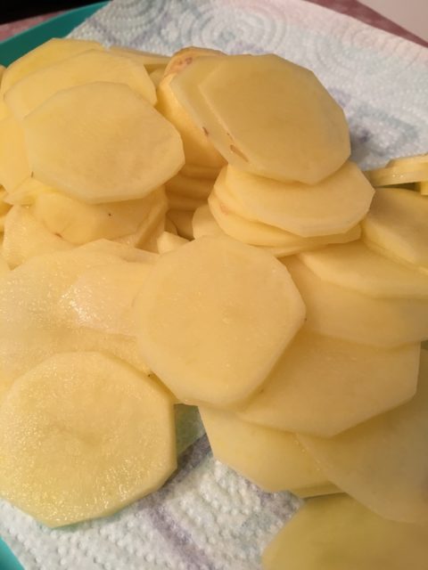 - Sbucciate e tagliate a fettine sottili le patatine, ancor meglio se utilizzate una mandolina, e mettetele da parte.