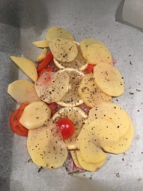 - Ponete 3/4 fettine di limone sopra al filetto, irrorate ancora con un filo d’olio, salate e pepate leggermente.