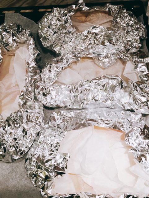 - Prendete un foglio di stagnola e ricoprite il cartoccio con l’orata, lasciando solo un piccolo spiraglio nella parte superiore.
