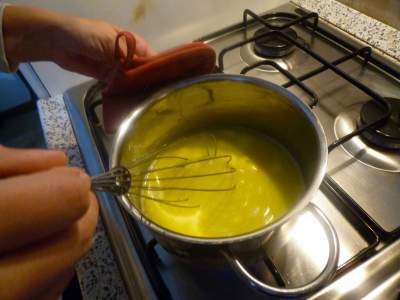 - Fate sciogliere il tutto a fuoco medio, facendo sfiorare l’ebollizione dell’acqua (se mentre l’acqua sfrigola il burro non si è ancora sciolto, togliete il tegame dal fuoco e mescolate per farlo sciogliere).