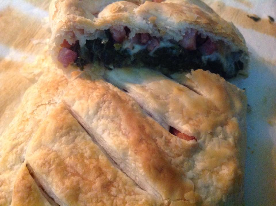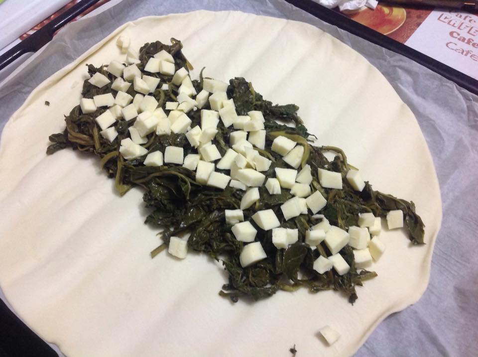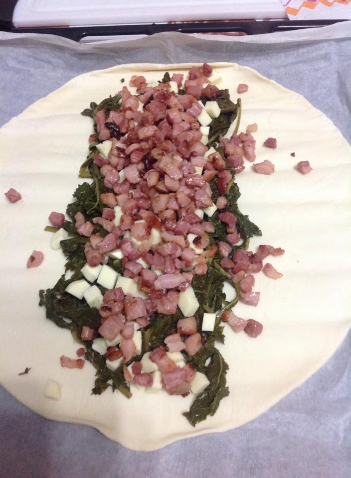 - Stendete la pasta sfoglia e metteteci sopra le bietole, poi la scamorza e infine la pancetta affumicata.