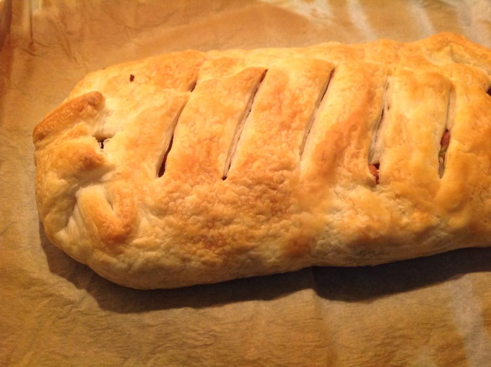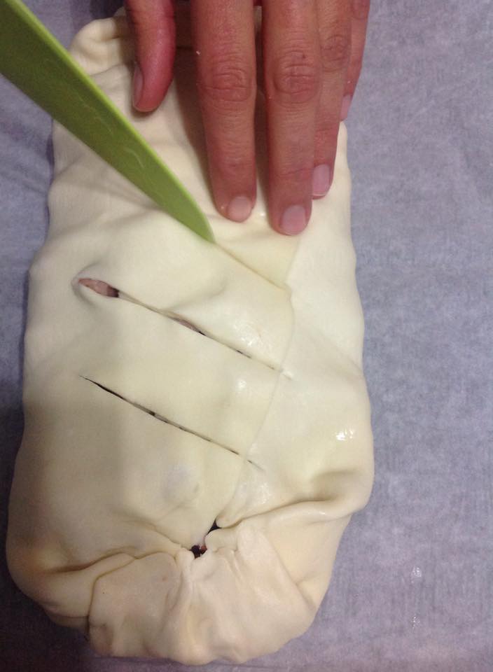 - Avvolgete la pasta sfoglia formando la classica forma dello strudel e incidete leggermente la superficie facendo dei tagli.